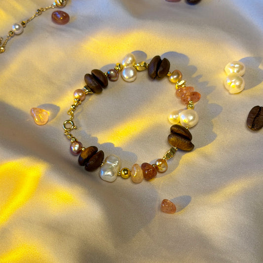 Handmade Coffee Bean and Baroque Pearl Bracelet, Pink Quartz Crystal Jewelry, 18k Gold Plated, Unique Gift for Coffee Lovers
